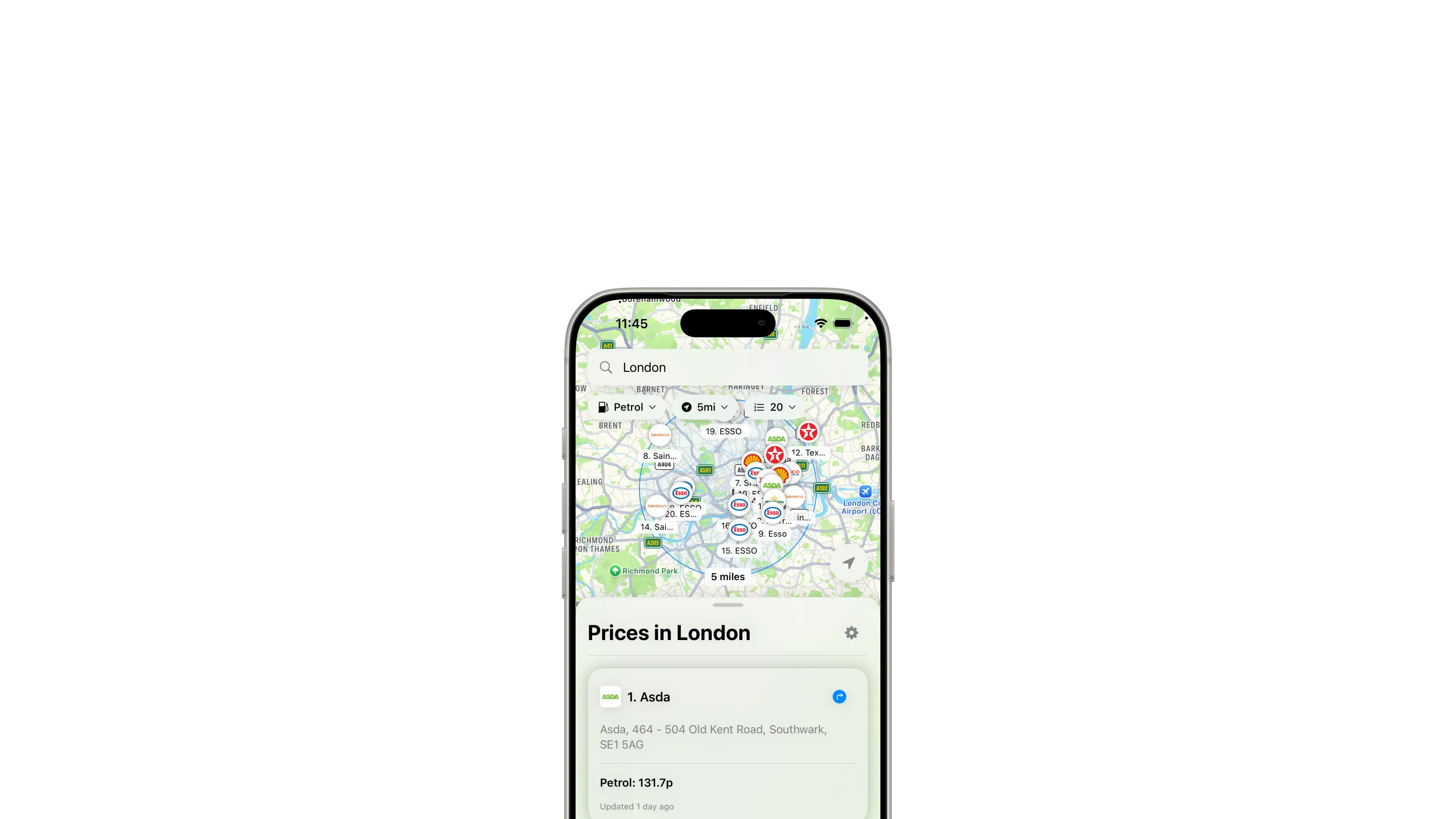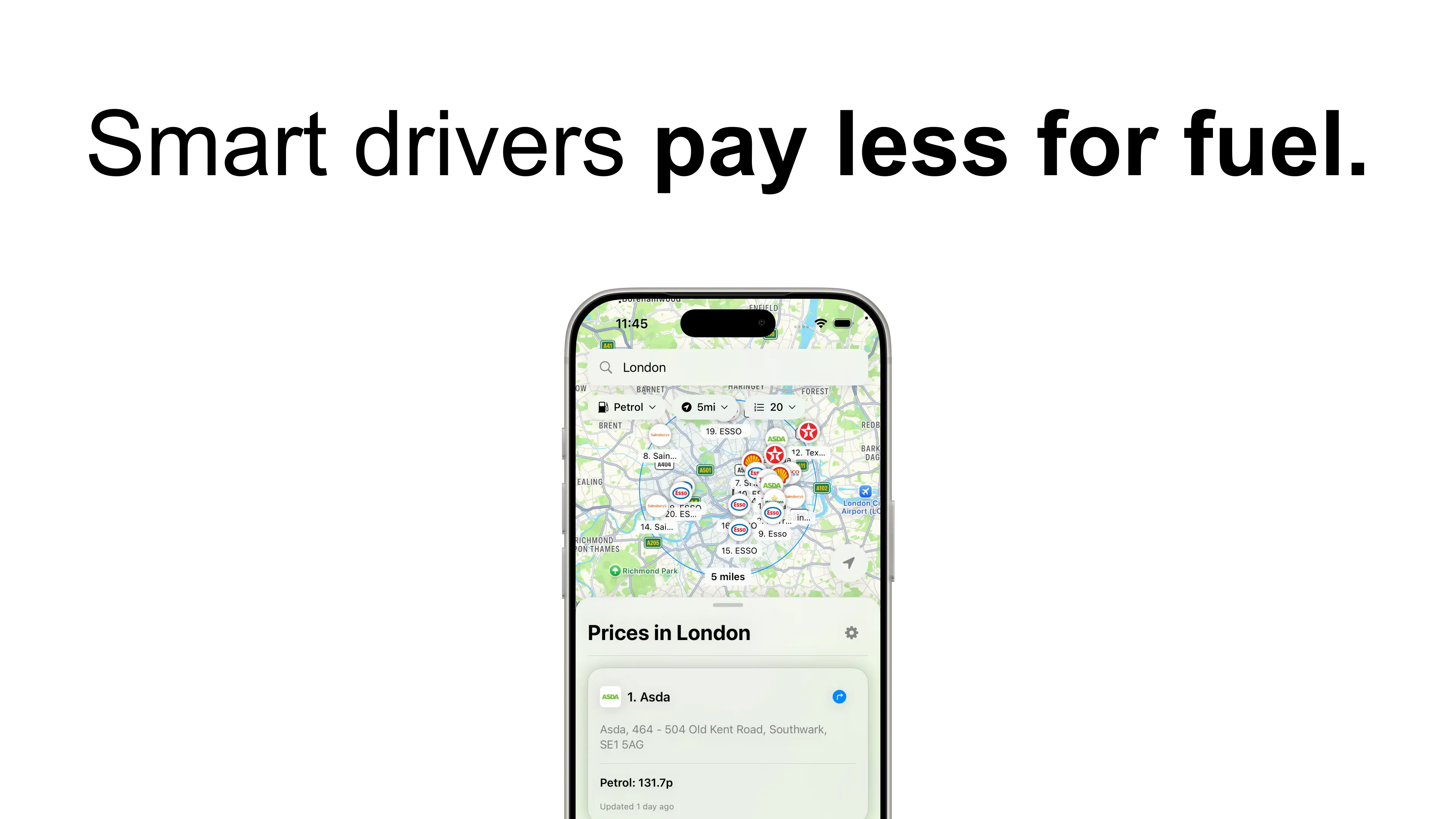 Real-time prices from BP, Shell, ESSO, Tesco, Asda, Morrisons, and more